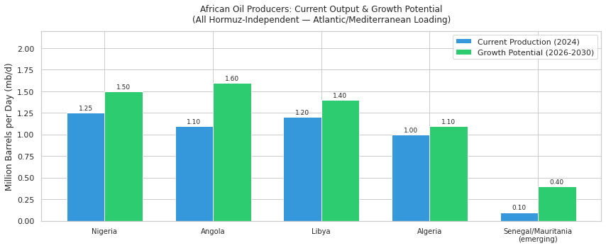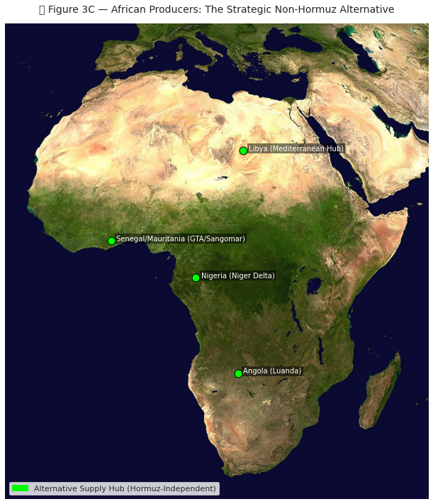 In addition to UAE and Soudi Arabia developing alternative routes, African producers — entirely outside the Hormuz system — are positioned to partially fill the supply gap. Their crude is Atlantic-basin sourced, loading from west-coast ports with direct access to European and Asian buyers via Cape of Good Hope routing.