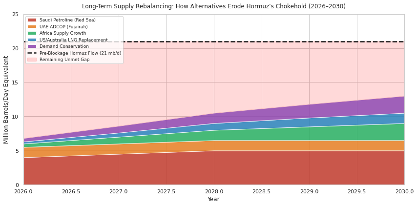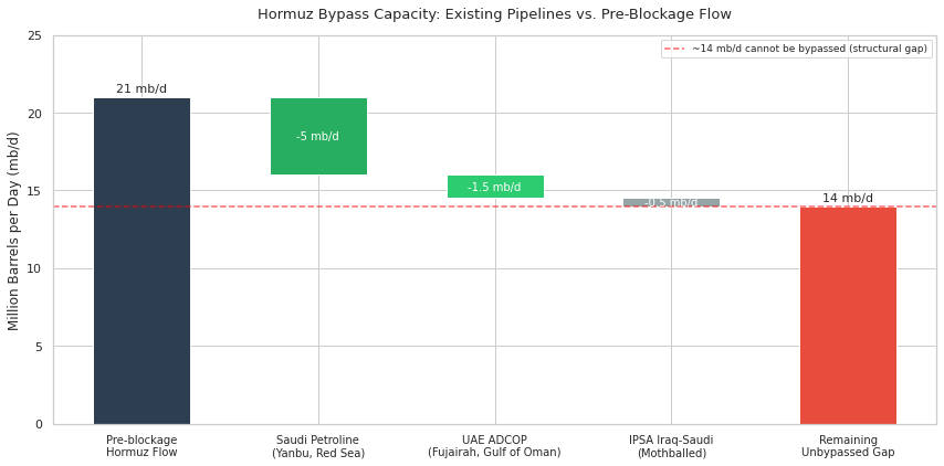 That gap remains the central problem. Even at maximum bypass use, the shortfall is on the order of 11–13 mb/d, and LNG has no equivalent bypass at all. The result is that pipeline alternatives soften the shock, but they do not come close to neutralizing it as of now. However developing these routes is a matter of financing and engineering, both solvable problems.
