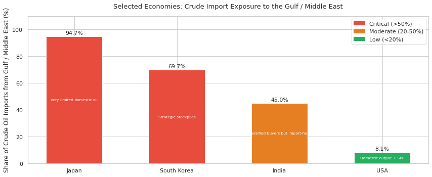 The bar chart below shows one specific metric only: the share of each country’s crude oil imports sourced from the Gulf / Middle East in the latest official data cited. It is therefore a measure of oil import exposure, not a full-spectrum measure of total energy dependence. Israel is not included in this crude-import chart because its insulation argument is mainly about domestic natural gas and electricity generation, which is a different metric.