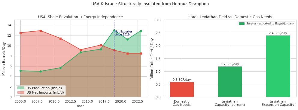 Hormuz disruption creates the sharpest direct energy pain for Asian importers, not for the two countries most central to the regional military balance. The United States is structurally insulated by domestic oil and gas production, low direct reliance on Persian Gulf crude, and the Strategic Petroleum Reserve. Israel’s insulation is different in form: it is not an LNG exporter, but its power system relies heavily on domestic offshore gas, which sharply reduces dependence on Gulf LNG and imported fuel oil for electricity.